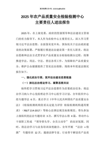 【七哥公文】2025年:2025年农产品质量安全检验检测中心主要责任人述法报告+更多免费公文+VX:QiGeGongWen2024