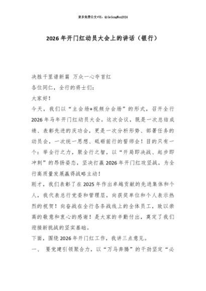 / 【七哥公文】2025年:2026年开门红动员大会上的讲话(银行)_副本+更多免费公文+VX:QiGeGongWen2024