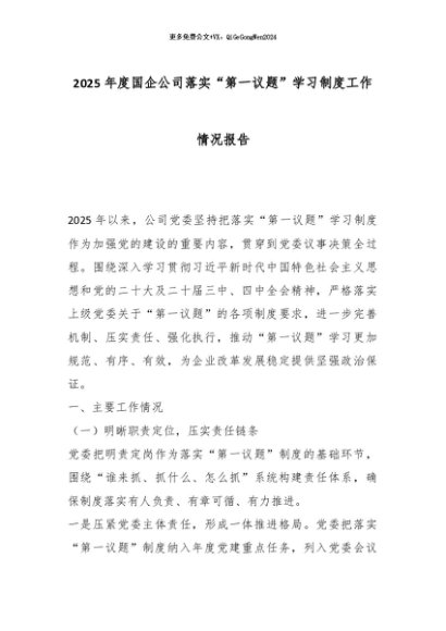 【七哥公文】2025年:2025年度国企公司落实“第一议题”学习制度工作情况报告_副本+更多免费公文+VX:QiGeGongWen2024