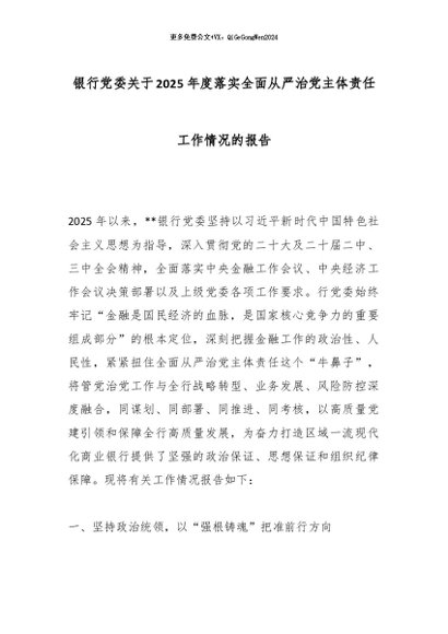 【七哥公文】2025年:银行党委关于2025年度落实全面从严治党主体责任工作情况的报告_副本+更多免费公文+VX:QiGeGongWen2024