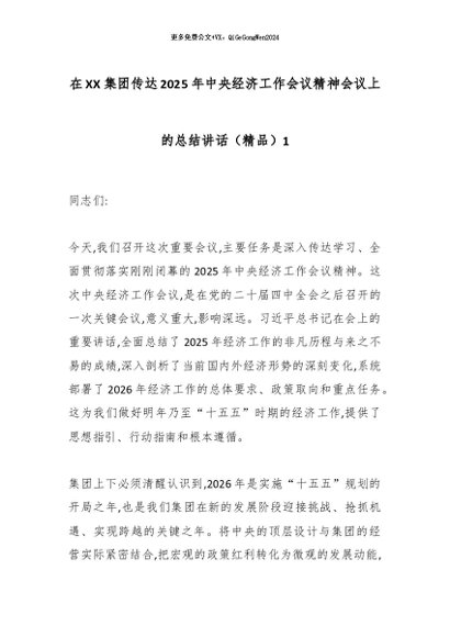 【七哥公文】2025年:在XX集团传达2025年中央经济工作会议精神会议上的总结讲话(精品)1_副本+更多免费公文+VX:QiGeGongWen2024