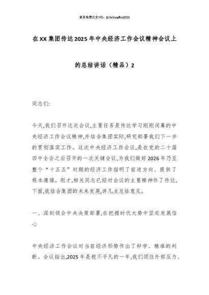 【七哥公文】2025年:在XX集团传达2025年中央经济工作会议精神会议上的总结讲话(精品)2_副本+更多免费公文+VX:QiGeGongWen2024