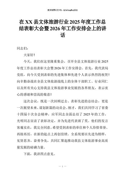 【七哥公文】2025年:在XX县文体旅游行业2025年度工作总结表彰大会暨2026年工作安排会上的讲话+更多免费公文+VX:QiGeGongWen2024