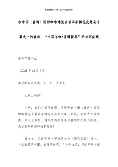 【七哥公文】2025年:在中国(普洱)国际咖啡博览会普洱茶博览交易会开幕式上的致辞:“中国茶咖•香遇世界”的普洱实践_副本+更多免费公文+VX:QiGeGongWen2024