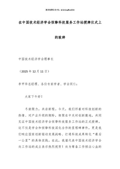 【七哥公文】2025年:在中国技术经济学会恒挚科技服务工作站授牌仪式上的致辞_副本+更多免费公文+VX:QiGeGongWen2024