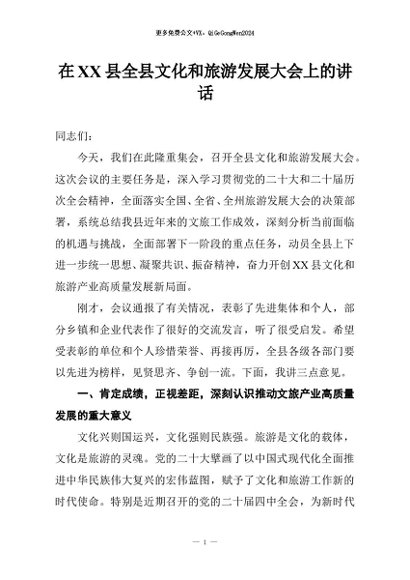 / 【七哥公文】2025年:在XX县全县文化和旅游发展大会上的讲话+更多免费公文+VX:QiGeGongWen2024