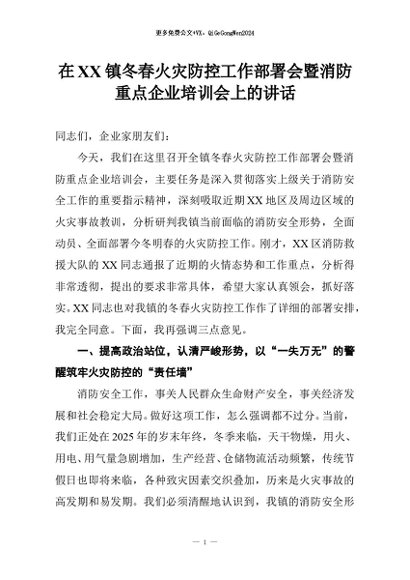 【七哥公文】2025年:在XX镇冬春火灾防控工作部署会暨消防重点企业培训会上的讲话+更多免费公文+VX:QiGeGongWen2024