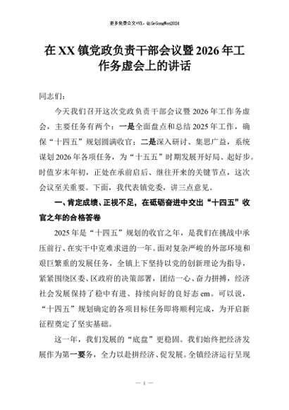【七哥公文】2025年:在XX镇党政负责干部会议暨2026年工作务虚会上的讲话+更多免费公文+VX:QiGeGongWen2024