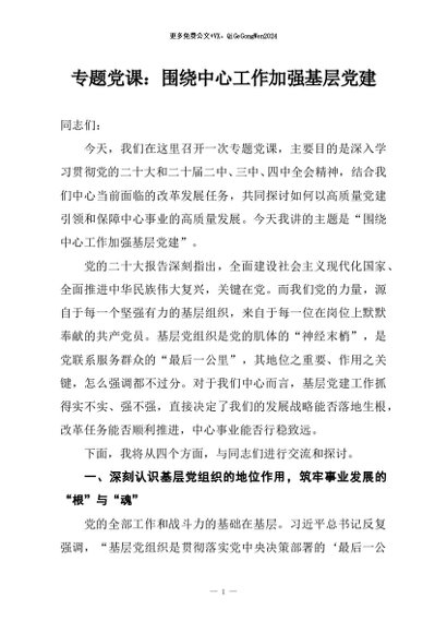 / 【七哥公文】2025年:专题党课:围绕中心工作加强基层党建+更多免费公文+VX:QiGeGongWen2024