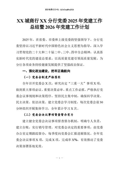 【七哥公文】2025年:XX城商行XX分行党委2025年党建工作总结暨2026年党建工作计划+更多免费公文+VX:QiGeGongWen2024