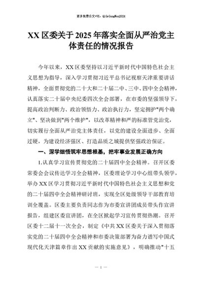 【七哥公文】2025年:XX区委关于2025年落实全面从严治党主体责任的情况报告+更多免费公文+VX:QiGeGongWen2024