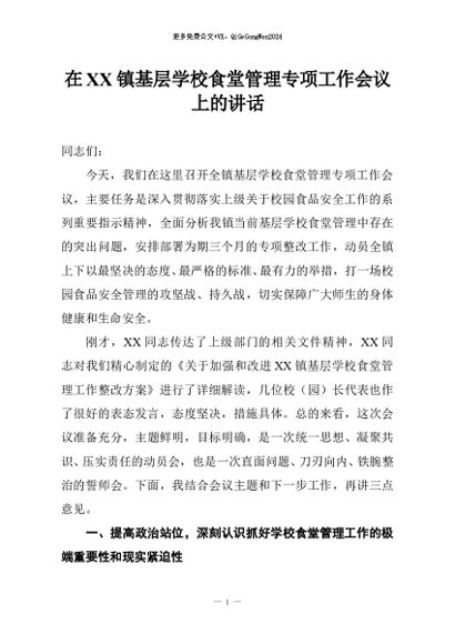 / 【七哥公文】2025年:在XX镇基层学校食堂管理专项工作会议上的讲话+更多免费公文+VX:QiGeGongWen2024