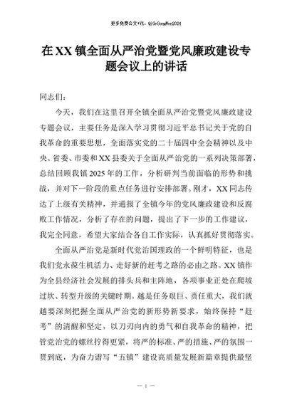 【七哥公文】2025年:在XX镇全面从严治党暨党风廉政建设专题会议上的讲话+更多免费公文+VX:QiGeGongWen2024