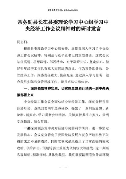 【七哥公文】2025年:常务副县长在县委理论学习中心组学习中央经济工作会议精神时的研讨发言+更多免费公文+VX:QiGeGongWen2024
