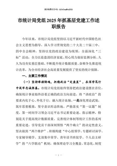 / 【七哥公文】2025年:市统计局党组2025年抓基层党建工作述职报告+更多免费公文+VX:QiGeGongWen2024