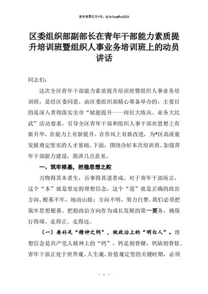 【七哥公文】2025年:区委组织部副部长在青年干部能力素质提升培训班暨组织人事业务培训班上的动员讲话+更多免费公文+VX:QiGeGongWen2024