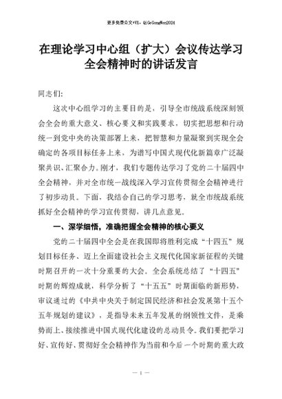 【七哥公文】2025年:在理论学习中心组(扩大)会议传达学习全会精神时的讲话发言+更多免费公文+VX:QiGeGongWen2024
