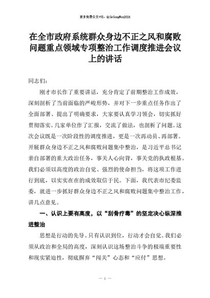 【七哥公文】2025年:在全市政府系统群众身边不正之风和腐败问题重点领域专项整治工作调度推进会议上的讲话+更多免费公文+VX:QiGeGongWen2024