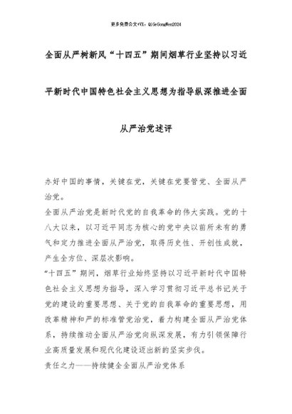 【七哥公文】2025年:全面从严树新风“十四五”期间烟草行业坚持以总书记新时代中国特色社会主义思想为指导纵深推进全面从严治党述评_副本+更多免费公文+VX:QiGeGongWen2024