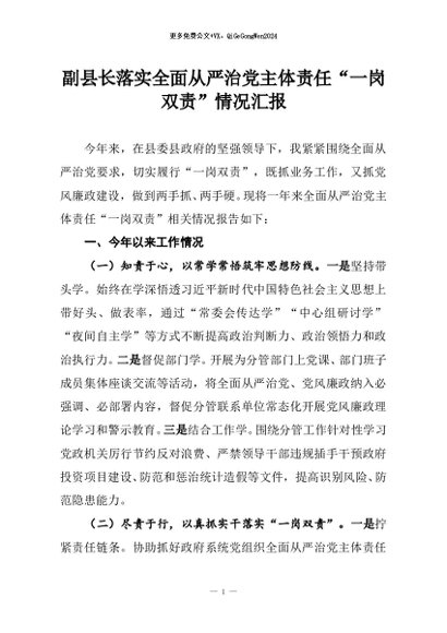/ 【七哥公文】2025年:副县长落实全面从严治党主体责任“一岗双责”情况汇报+更多免费公文+VX:QiGeGongWen2024