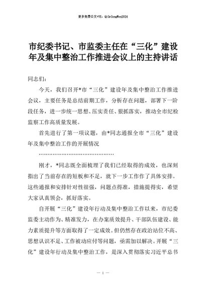 【七哥公文】2025年:市纪委书记、市监委主任在“三化”建设年及集中整治工作推进会议上的主持讲话+更多免费公文+VX:QiGeGongWen2024