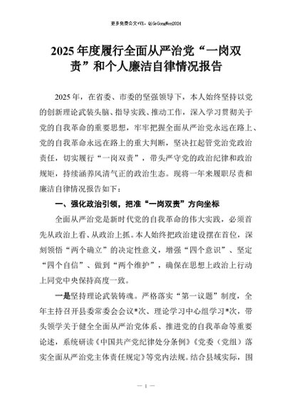 【七哥公文】2025年:2025年度履行全面从严治党“一岗双责”和个人廉洁自律情况报告+更多免费公文+VX:QiGeGongWen2024