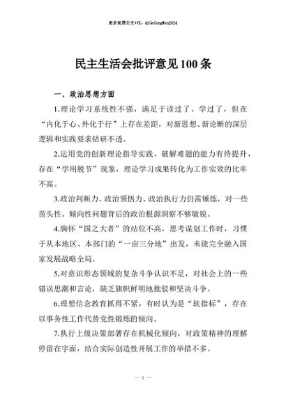 / 【七哥公文】2025年:民主生活会批评意见100条+更多免费公文+VX:QiGeGongWen2024