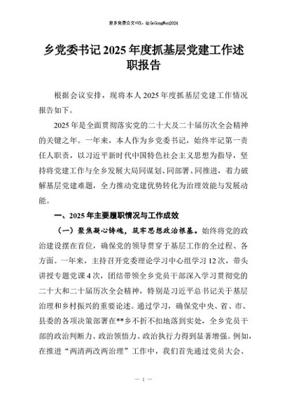 / 【七哥公文】2025年:乡党委书记2025年度抓基层党建工作述职报告+更多免费公文+VX:QiGeGongWen2024