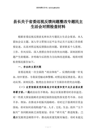 【七哥公文】2025年:县长关于省委巡视反馈问题整改专题民主生活会对照检查材料+更多免费公文+VX:QiGeGongWen2024