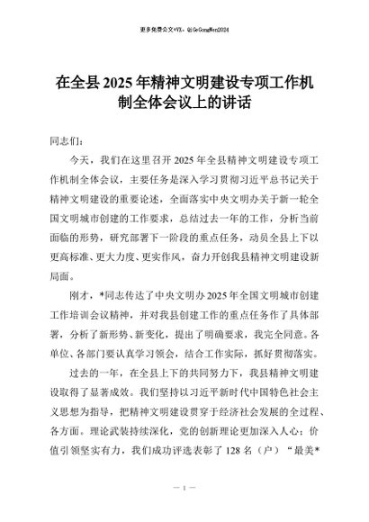 【七哥公文】2025年:在全县2025年精神文明建设专项工作机制全体会议上的讲话+更多免费公文+VX:QiGeGongWen2024