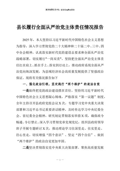 / 【七哥公文】2025年:县长履行全面从严治党主体责任情况报告+更多免费公文+VX:QiGeGongWen2024