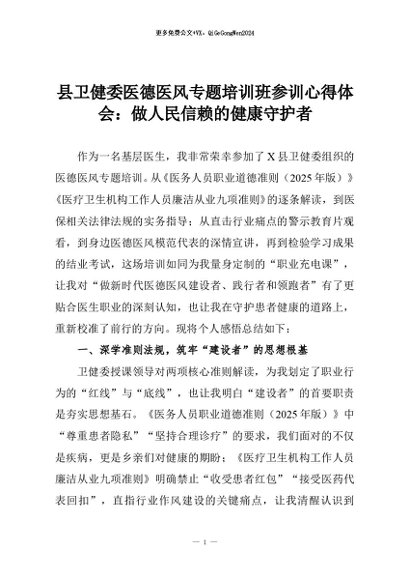 【七哥公文】2025年:县卫健委医德医风专题培训班参训心得体会:做人民信赖的健康守护者+更多免费公文+VX:QiGeGongWen2024