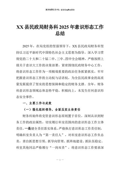 / 【七哥公文】2025年:XX县民政局财务科2025年意识形态工作总结+更多免费公文+VX:QiGeGongWen2024