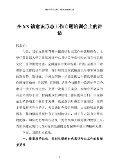 / 【七哥公文】2025年:在XX镇意识形态工作专题培训会上的讲话+更多免费公文+VX:QiGeGongWen2024
