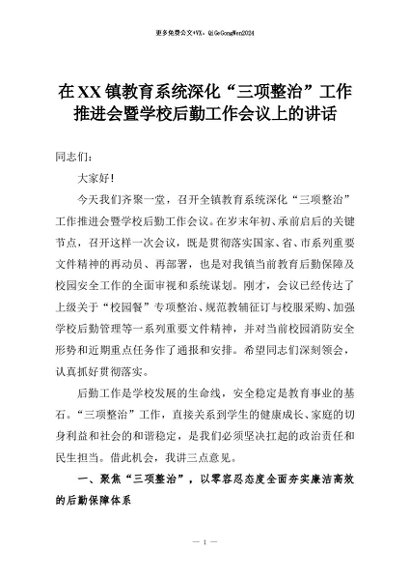 【七哥公文】2025年:在XX镇教育系统深化“三项整治”工作推进会暨学校后勤工作会议上的讲话+更多免费公文+VX:QiGeGongWen2024