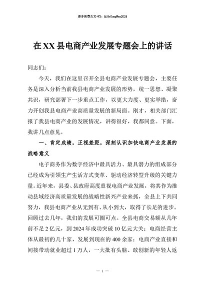 / 【七哥公文】2025年:在XX县电商产业发展专题会上的讲话+更多免费公文+VX:QiGeGongWen2024