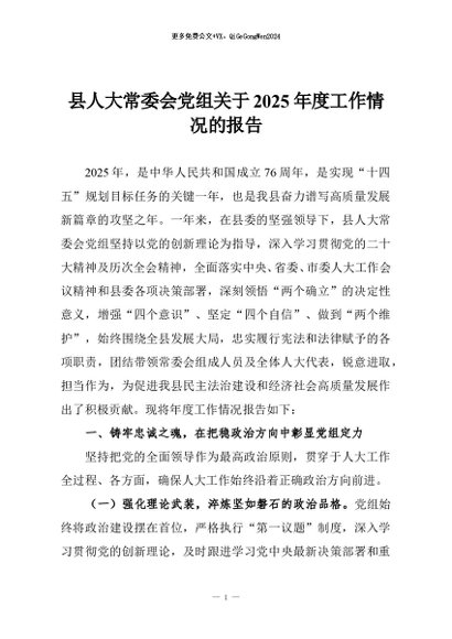 / 【七哥公文】2025年:县人大常委会党组关于2025年度工作情况的报告+更多免费公文+VX:QiGeGongWen2024