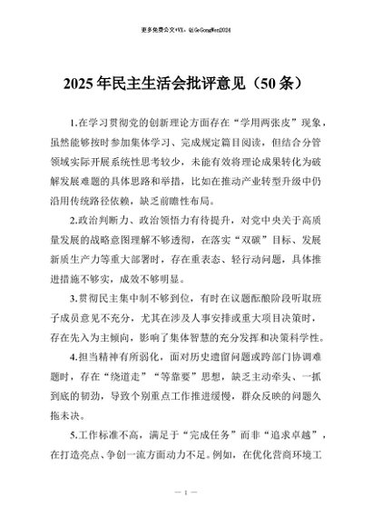 / 【七哥公文】2025年:2025年民主生活会批评意见(50条)+更多免费公文+VX:QiGeGongWen2024