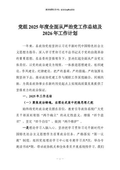 【七哥公文】2025年:党组2025年度全面从严治党工作总结及2026年工作计划+更多免费公文+VX:QiGeGongWen2024