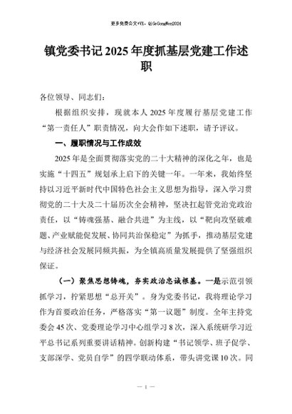 / 【七哥公文】2025年:镇党委书记2025年度抓基层党建工作述职+更多免费公文+VX:QiGeGongWen2024