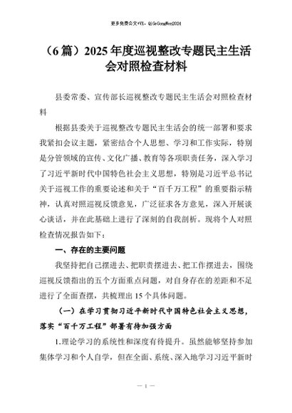 【七哥公文】2025年:(6篇)2025年度巡视整改专题民主生活会对照检查材料+更多免费公文+VX:QiGeGongWen2024