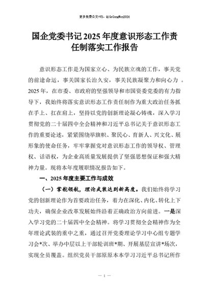【七哥公文】2025年:国企党委书记2025年度意识形态工作责任制落实工作报告+更多免费公文+VX:QiGeGongWen2024