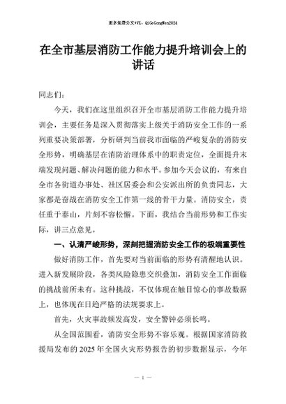 / 【七哥公文】2025年:在全市基层消防工作能力提升培训会上的讲话+更多免费公文+VX:QiGeGongWen2024