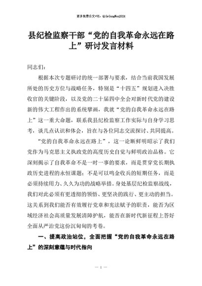 【七哥公文】2025年:县纪检监察干部“党的自我革命永远在路上”研讨发言材料+更多免费公文+VX:QiGeGongWen2024
