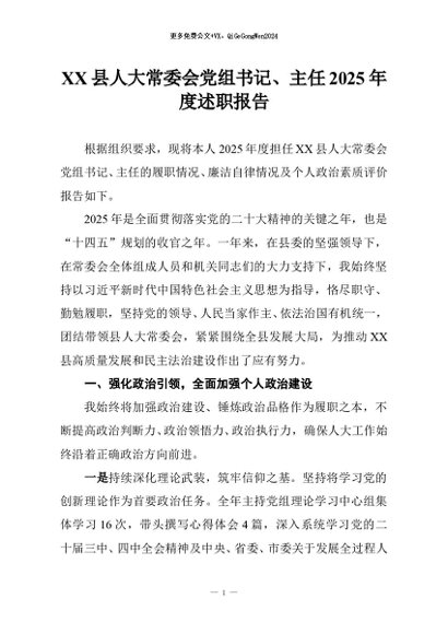 【七哥公文】2025年:XX县人大常委会党组书记、主任2025年度述职报告+更多免费公文+VX:QiGeGongWen2024