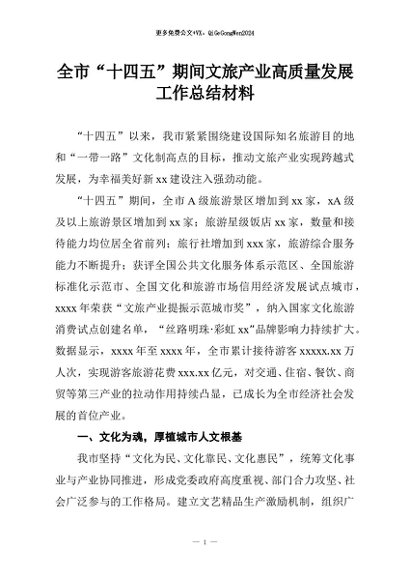 / 【七哥公文】2025年:全市“十四五”期间文旅产业高质量发展工作总结材料+更多免费公文+VX:QiGeGongWen2024