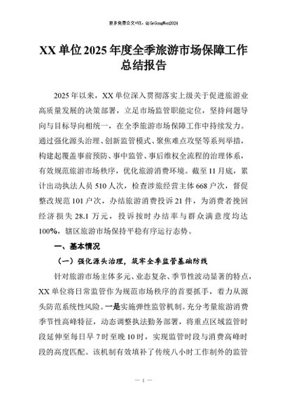 / 【七哥公文】2025年:XX单位2025年度全季旅游市场保障工作总结报告+更多免费公文+VX:QiGeGongWen2024