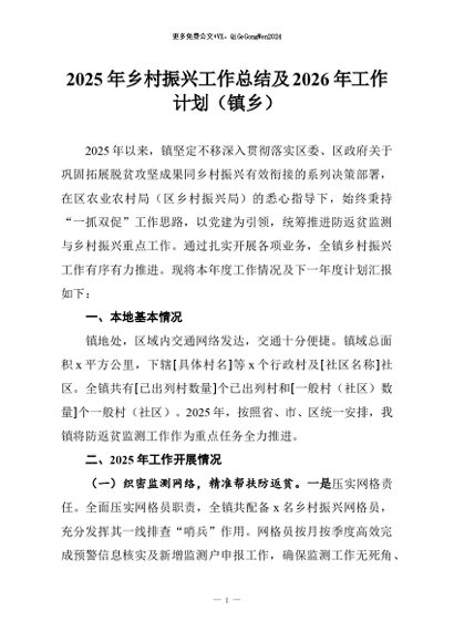 【七哥公文】2025年:2025年乡村振兴工作总结及2026年工作计划(镇乡)+更多免费公文+VX:QiGeGongWen2024