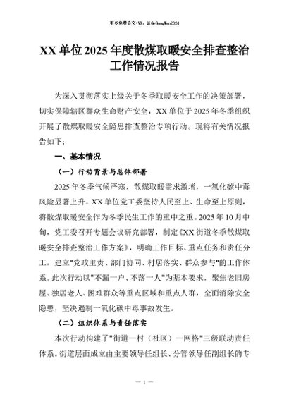 【七哥公文】2025年:XX单位2025年度散煤取暖安全排查整治工作情况报告+更多免费公文+VX:QiGeGongWen2024