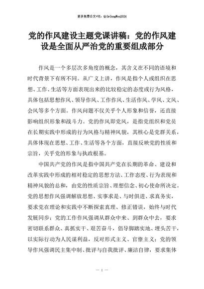 【七哥公文】2025年:党的作风建设主题党课讲稿:党的作风建设是全面从严治党的重要组成部分+更多免费公文+VX:QiGeGongWen2024